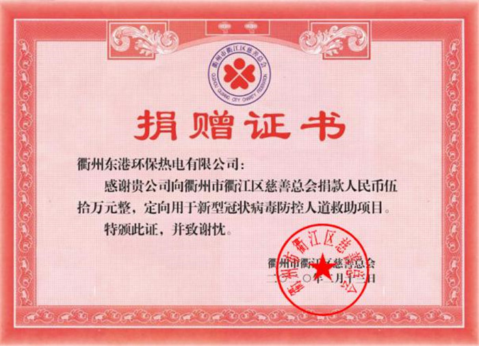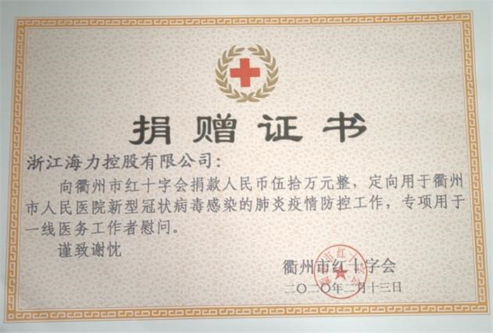 2月13日,市侨联副主席、市留联会会长、浙江海力控股董事长江云锋收到了2份捐赠证书,浙江海力控股有限公司及其下属的衢州东港环保热电有限公司,分别通过衢州市红十字会定向捐赠给衢州市人民医院50万元用于慰问一线医务工作者,通过衢江区慈善总会定向捐赠给衢州市第二人民医院50万元用于疫情防控人道救助,2项共计100万元。