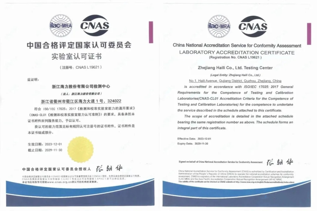 2023年12月1日,浙江海力股份有限公司成功获得中国合格评定国家认可委员会(简称CNAS)授予的实验室认可证书,这标志着海力股份在实验室硬件设施设备、检测技术能力和管理水平等方面均已达到权威认可标准。